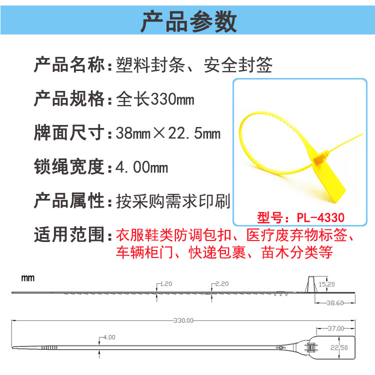 产品名称:PL-4330塑料封条 产品结构:一次注塑成型