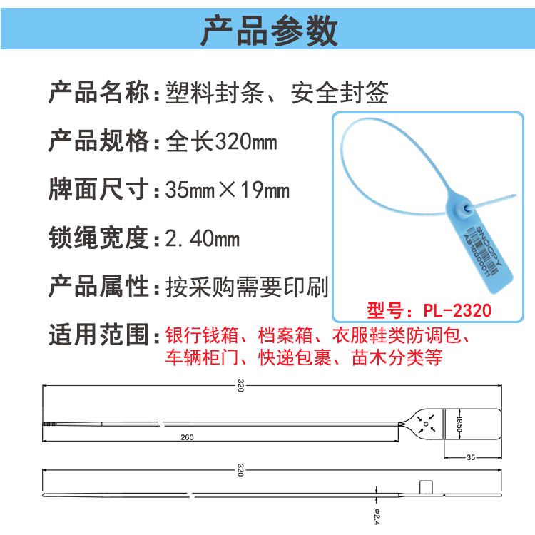 产品名称:PL-2320塑料封条 产品结构:装配型,圆形锁芯