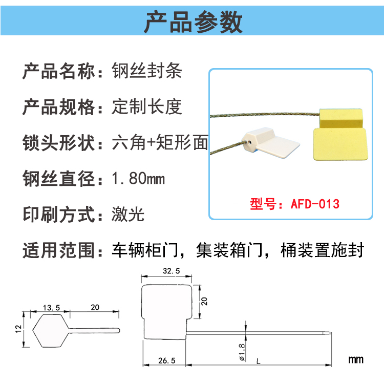 产品名称:AFD-013六角带牌钢丝封条 产品结构:抽紧式