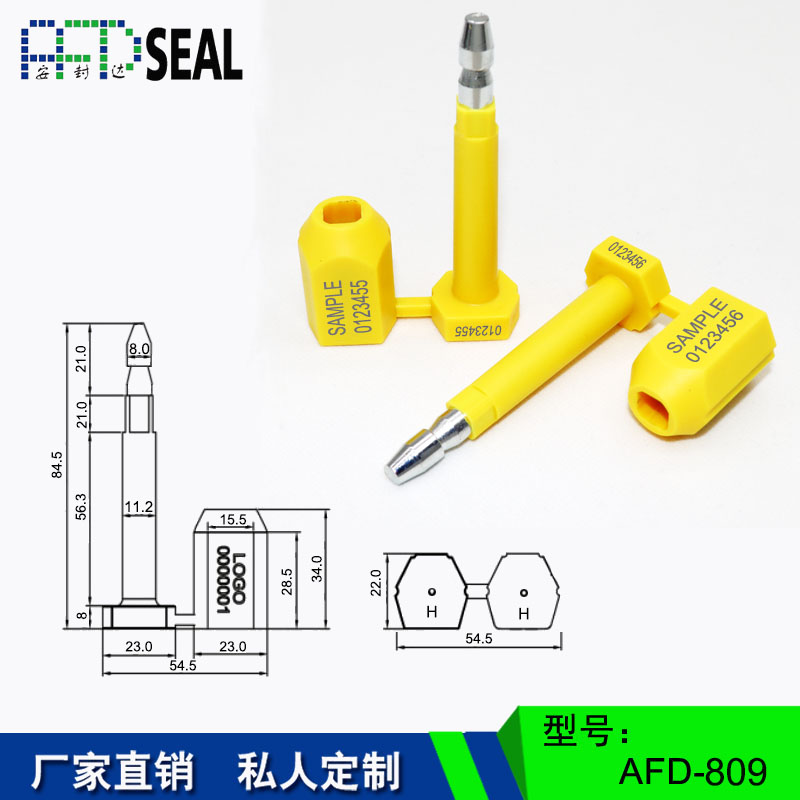 产品参数 产品名称:PL-809高保封条 产品材质:A3钢锁杆和锁套 产品颜色:红色、黄色、蓝色、绿色、橙色、白色 产品规格:杆全长84.5mm ,杆帽直径23mm,锁套全长34mm,锁套直径23 印刷标识:按客户要求激光镭射标刻logo及流水号